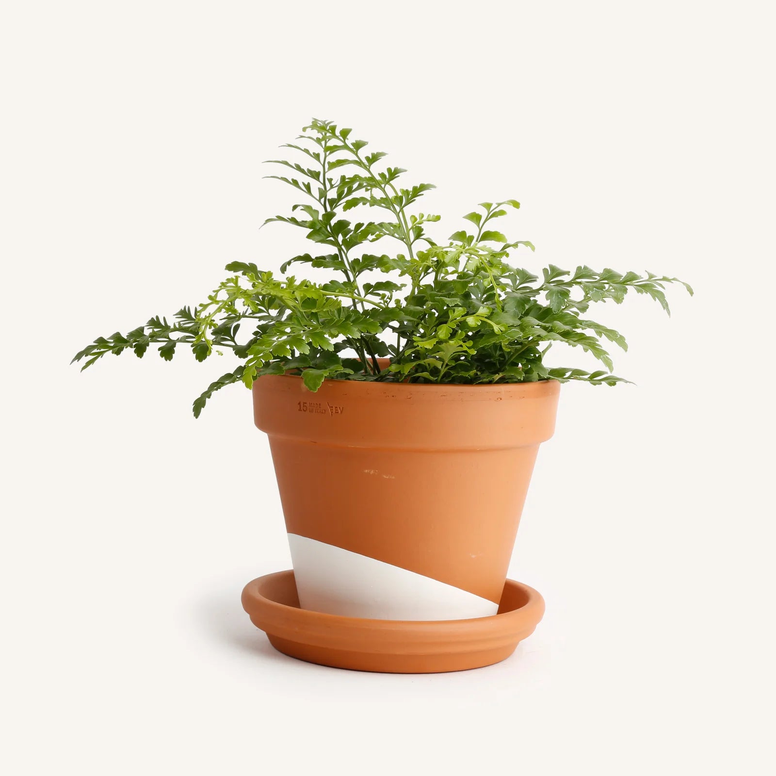 Originaria de Australia y del sudeste asiático, la Austral Gem Fern (Asplenium dimorphum x difforme) es un helecho híbrido resistente y elegante, apreciado por su follaje oscuro, brillante y de textura coriácea. A diferencia de otros helechos, sus hojas son más gruesas y resistentes, lo que le permite conservar humedad y tolerar mejor condiciones interiores. Su apariencia compacta y exuberante la hace perfecta para estanterías, escritorios o baños con buena luz.